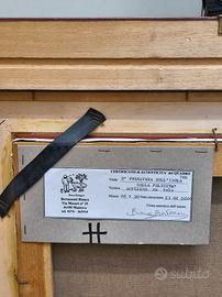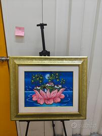 Questo dipinto è un'opera d'arte Naif dell'artista italiana Bianca Bertazzoni. È una composizione onirica e simbolica che trasmette un senso di serenità e romanticismo.