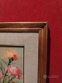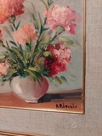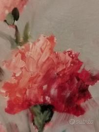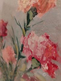 Bellissimo dipinto raffigurante un vaso di garofani. I colori sono vivaci e ben definiti, creando un'atmosfera allegra e romantica. Consegna a mano su Roma.