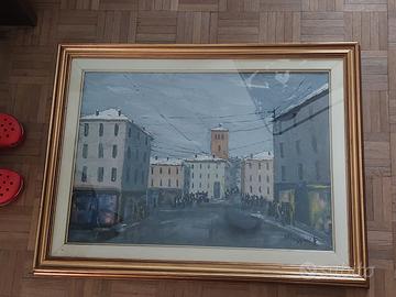 La scena ritrae una piazza innevata nel cuore storico di Monza, con edifici dalle facciate sobrie e un campanile che domina lo sfondo. Le figure umane, appena accennate, animano l’ambiente con discrezione, mentre il cielo grigio e le tonalità fredde evocano un’atmosfera invernale raccolta e suggestiva. Un’opera che parla di memoria, silenzio e bellezza quotidiana.