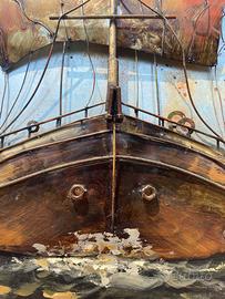 Quadro realizzato con materiali di recupero principalmente ferro in rilievo sui toni del grigio/ruggine e rosso, raffigurante un maestoso veliero.
