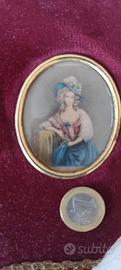 Il ventaglio presenta 3 cornicette di forma ovale con vetro bombato (bordi dorati) contenenti 3 riproduzioni (no dipinti) in miniatura raffiguranti damine francesi settecentesche (vedi foto annuncio).