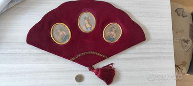Causa inutilizzo vendo quadretto a forma di ventaglio vintage (anni '40/'50) in morbidissimo velluto bordeaux rifinito con raffinata passamaneria colore oro antico; in basso penzola un pon-pon in raso.