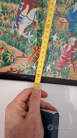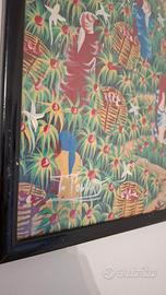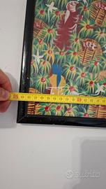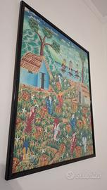 Splendido quadro vintage di arte naif o folk art, probabilmente di origine caraibica o haitiana, firmato F. Polvard (o simile). L'opera presenta una vibrante scena di raccolta di frutti o caffè in un paesaggio tropicale, con figure che lavorano, case tradizionali e navi all'orizzonte. I colori sono intensi e saturi, tipici di questo stile. Il dipinto misura circa 40 cm x 60 cm ed è racchiuso in una cornice essenziale nera. La condizione del fronte (opera) è ottima, come dichiarato dall'utente. Si segnala che la cornice mostra lievi segni del tempo e il pannello posteriore in cartone presenta segni di umidità dovuti all'età, che non compromettono l'integrità visiva dell'opera stessa. Un pezzo d'arredamento unico per chi ama l'arte esotica e colorata.