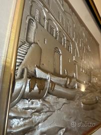 Splendido quadro decorativo con bassorilievo a sbalzo raffigurante un suggestivo paesaggio costiero italiano (probabilmente una veduta di Amalfi o Positano). L'opera presenta una lavorazione tridimensionale molto dettagliata che crea bellissimi giochi di luce grazie alla finitura metallica.
