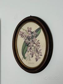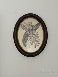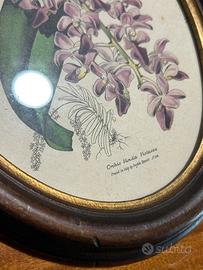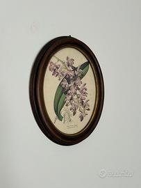 Eleganza Botanica: Orchis Vanda Violacea Al centro della composizione spicca l'Orchis Vanda Violacea (oggi nota come Aerides crassifolium) L'illustrazione cattura l'essenza esotica dell'orchidea attraverso una cascata di fiori carnosi dalle sfumature violacee e rosate, che contrastano armoniosamente con le grandi foglie verde smeraldo dal portamento scultoreo. La stampa è un esempio della tradizione tipografica italiana. La carta dal tono avorio antico conferisce al pezzo un'aura vissuta e autentica, tipica delle tavole contenute nei grandi album botanici vittoriani come "The Orchid Album'(circa 1882). L'opera è racchiusa in una cornice ovale in legno scuro impreziosita da un sottile filetto dorato interno che illumina il soggetto e ne sottolinea l'importanza. La forma ovale, classica e senza tempo, dona al quadro una morbidezza visiva che lo rende perfetto per ambienti eleganti, studi professionali o pareti "galleria" dal gusto vintage.