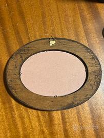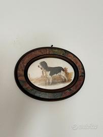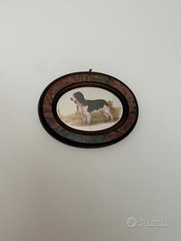Ritratto naturalistico di uno Springer Spaniel inglese. Il cane è raffigurato di profilo, in posizione stante, immerso in un paesaggio campestre dai toni autunnali. 15x20x2 Attribuibile a Joel Kirk, rinomato artista naturalista britannico contemporaneo, celebre per la sua capacità di catturare l'anima della fauna selvatica e delle razze canine tradizionali. Stampa artistica vintage di alta qualità su supporto cartaceo, caratterizzata da una palette cromatica morbida che spazia dall'ocra dei campi al verde sottobosco. Elegante cornice ovale in legno. Il bordo interno è impreziosito da una decorazione pittorica a motivi vegetali stilizzati nei toni del rosso antico e del verde scuro, che crea un effetto di profondità e richiama lo stile English Country.