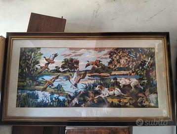 QUADRO VINTAGE RAFFIGURANTE SCENA DI CACCIA IN TESSUTO DIMENSIONI 75CM X 135 CM