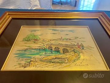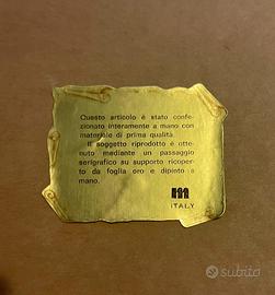 Quadro elegante vintage dipinto a mano su foglia oro, pezzo unico da collezione per gli amanti dell’artigianalità italiana. Il quadro si presenta in perfette condizioni e presenta una targhetta sul retro del quadro che ne specifica le qualità. Il soggetto riprodotto è ottenuto mediante un passaggio serigrafico su supporto ricoperto da foglia oro e dipinto a mano.