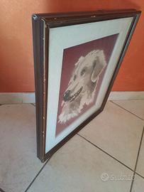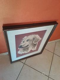 Splendido quadro vintage realizzato interamente a mano con la tecnica del mezzo punto (petit point) o punto croce. Il ricamo raffigura con grande dettaglio il profilo di un cane (razza Golden Retriever o Setter) su un elegante sfondo color bordeaux. L'opera è già incorniciata con una cornice in legno scuro che ne esalta lo stile classico, completa di vetro protettivo e passepartout in tessuto chiaro. Perfetto per arredare studi, salotti o per appassionati di razze canine e artigianato d'epoca. Tecnica: Ricamo a mano su tela. Soggetto: Ritratto canino. Dimensioni totali (con cornice): 42 cm x 49 cm. Condizioni: Ottime condizioni vintage. La cornice presenta lievi segni del tempo che ne attestano l'autenticità (come visibile in foto). #QuadroVintage #PuntoCroce #MezzoPunto #GoldenRetriever #Setter #ArredamentoClassico #RicamoAMano #Collezionismo #DogArt #HandmadeVintage #QuadroCane