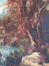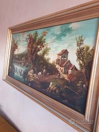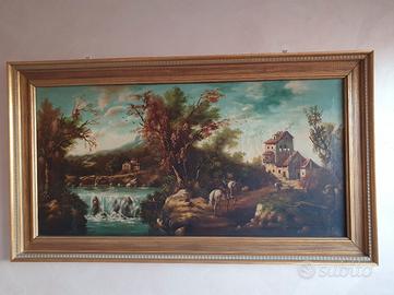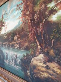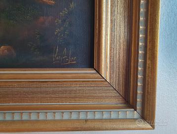 Vendo suggestivo quadro d'epoca da parete, raffigurante un classico e rilassante paesaggio campestre. Un complemento d'arredo perfetto per dare un tocco rustico ed elegante a salotti, tavernette, ingressi o case di campagna. Caratteristiche: Struttura: Dipinto di gusto classico (probabilmente olio su tela o cartone telato) incorniciato in una massiccia e pregevole cornice in legno, arricchita da modanature dorate e dettagli chiari scanalati, dal tipico design anni '70/'80. Dettagli: La scena illustra un paesaggio bucolico ricco di elementi pittoreschi: un corso d'acqua con piccola cascata, un casolare rustico in pietra, alberi frondosi e un viandante a cavallo. In basso a destra è ben visibile la firma "Van Arber". Condizioni: Il quadro e la cornice si presentano in ottime condizioni generali. I colori del dipinto sono vividi e ben conservati. Essendo un oggetto vintage, la cornice potrebbe presentare lievissimi e normali segni del tempo che non ne intaccano la bellezza. Pronta da appendere. Ritiro a mano a Torino (zona Santa Rita). Disponibile per altre foto. Prezzo trattabile.