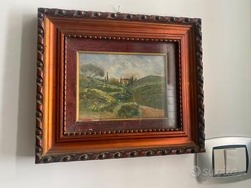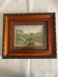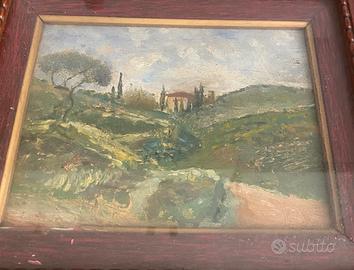 Grazioso quadro vintage, prima metà del ‘900. Olio su tavoletta di legno, raffigurante paesaggio collinare mediterraneo con cipressi e casa di campagna. completo di cornice in legno decorata e vetro di protezione, pronto per essere appeso. Misure solo dipinto: 19 x 12. Misure con cornice: 26 x 23. Ideale come elemento decorativo per casa o studio, in ambiente in stile classico o rustico . Prezzo trattabile per ritiro a mano