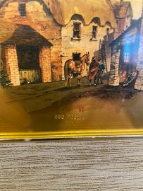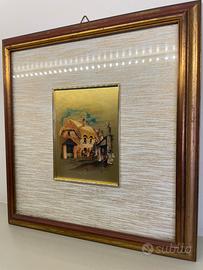 Splendido quadretto vintage dipinto su foglia d’oro, come indicato. Raffigurazione suggestiva di scena rurale con casetta dal tetto in paglia, dai toni caldi ed eleganti.