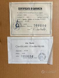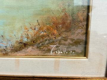 Opera decorativa e piacevole, tipica del gusto paesaggistico italiano anni ’70‑’80 Titolo: Pavia, lungo il TicinoData: 1980Tecnica: Olio su telaDimensioni: 40 x 60 cm L’opera raffigura una veduta fluviale di Pavia, riconoscibile dal profilo urbano e dalla cupola della Basilica o della Cattedrale visibile sullo sfondo. La composizione è tipicamente equilibrata, con la linea dell’acqua che occupa i due terzi inferiori e la città posta in linea d’orizzonte. Nel retro troviamo due certificati: 1. Certificato di garanzia (Accademia delle Belle Arti della Repubblica Araba d’Egitto – Roma, 1980), con timbro e firma; 2. Certificato d’autenticità di Vito Tibollo, con valutazione 500.000 lire. Dimensioni: L 85cm / A 64cm/ P 6.5 cm Disponibile per il ritiro a mano o spedizione assicurata con imballaggio professionale.