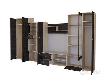 La parete attrezzata Madrid, con pratico vano appendiabiti, è un set di mobili elegante e funzionale, perfetto per il soggiorno, che combina spazio di archiviazione ed estetica; è compatta, pensata sia per piccoli soggiorni che per ampi saloni. Questa combinazione offre ampio spazio di stoccaggio. Una teca in vetro metterà in risalto le decorazioni su di essa e conferirà un carattere unico all’insieme. La parete attrezzata modello Madrid, realizzata con materiali di qualità, è semplice da montare e non richiede l’impiego di tasselli per il fissaggio alla parete. Il peso di questa parete attrezzata è di ben 237 kg!