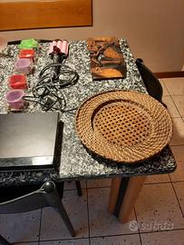 1 videoregistratore 1 hard disk 1 piastra x capelli 3 lampade da muro con lampadine 1 piatto in rattan 1 quadretto etnico Formine x dolci