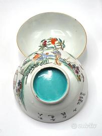 Serie di quattro ciotole in porcellana decorata Cina, XX secolo cm. 6x16x16 cad. Raffinato servizio di quattro ciotole in porcellana bianca a fondo smalto, di forma troncoconica con orlo dorato, appartenenti alla tradizione dellafamiglia verde(falangcai / fencai) con decorazione policroma a smalti sovrapposti. Le ciotole presentano dimensioni uniformi e decorazione coerente, a conferma della loro origine come servizio coordinato. La parete esterna di ciascuna ciotola è decorata con una scena di figura femminile in giardino — le cosiddette“belle di corte”(meiren) — ritratte tra elementi vegetali quali rami di melograno in fiore, peonie arancioni e fogliame verde, in un paesaggio primaverile arioso su fondo bianco. Le figure indossano abiti tradizionali dalle tinte delicate in verde, blu e arancio. A fianco delle scene pittoriche compaionoiscrizioni in caratteri cinesi in stile calligrafico, con sigillo rosso, di contenuto poetico o augurale. Questo dettaglio conferisce alle ciotole un carattere colto e raffinato, tipico della produzione ceramica destinata all’élite letterata. L’interno di ciascuna ciotola reca al centro un motivo floreale conrami di melograno— simbolo di fertilità e abbondanza — dipinti con delicatezza su fondo bianco latte. Il piede è smaltato inturchese, colore caratteristico di alcune produzioni cinesi di pregio del XX secolo. Sul fondo esterno sono visibili ulteriori iscrizioni calligrafiche con sigillo, probabilmente riferibili all’autore o alla manifattura. L’iscrizione visibile nell’immagine di dettaglio riporta caratteri leggibili come riferimento alperiodo Guangxu(光緒) con indicazione di provenienza dalla provincia dello Jiangxi (江西) e firma dell’arteficeZhang Zhichang(張志昌). Tutti questi elementi collocano la produzione o il suo modello ispiratore nella tradizione accademica di Jingdezhen. Stato di conservazione:buono per tutte e quattro le ciotole; lievi segni d’uso coerenti con l’epoca.