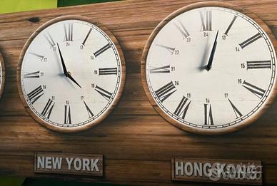 Bellissimo quadro stile canvas su telaio in legno con 4 orologi funzionanti per indicare 4 fusi orari, Londra, Hong Kong, Parigi e New York.