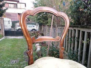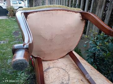 regalo quattro sedie antiche a chi viene a ritirarle, legno massello, artigianali, seduta imbottita e con molloni di sospensione, stoffa della seduta fissata con chiodi.