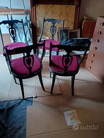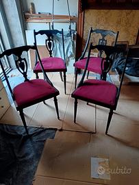 Quattro sedie la struttura è molto solida mentre la seduta è da rivedere lo stile si avvicina molto a quello Veneziano 5 euro per ogni sedia preferibilmente ritiro a mano altrimenti il trasporto costa più che le sedie