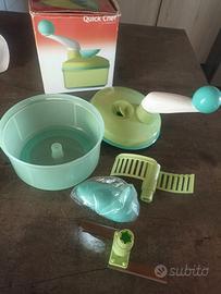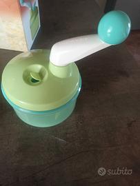 Quick chef Tupperware trita rapidamente frutta e verdure .La frusta ad elica consente di amalgamare e montare gli ingredienti per preparare creme e salse . L'accessorio a imbuto è ideale per aggiungere olio in piccole quantità durante la preparazione di maionese e salse ,il bordo antiscivolo impedisce al contenitore di rovesciarsi.