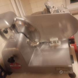 Affettatrice di media dimensione ideale per affettare salumi, carni, formaggi e pane come nuova, usata pochissimo. Revisionata in ottobre 2024CARATTERISTICHE:basamento in alluminio laccato con vernici alimentari coprilama, piatto merci, paratia di regolazione fetta e anello fisso di protezione lama in alluminio con ossidazione anodica lucida.Lama Ø 250 mmPotenza Motore 140 WattCapacità di taglio 230x185 (±5) mmCorsa carrello 255 mmDimensioni massime 530 x 442 x H 345 mmDimensione appoggio 400 x 250 mmPeso 14 kgBasamento Laccato Affilatoio AmovibileSpessore massimo di taglio 14÷16 mm