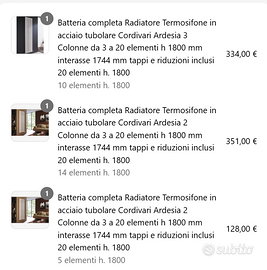 Causa cambio progetto ristrutturazione vendo 9 radiatori in acciaio, colore bianco, marca cordivari. 8 di altezza 1800mm con interasse 1744mm, 1 di altezza 600mm interasse 544mm. Gli 8 da 1800mm sono: 5 da 3 colonne; 14, 12, 12, 10, 12 elementi ciascuno. 3 da 2 colonne; 8, 5, 14 elementi ciascuno. Il radiatore di altezza 600mm ha 3 colonne e 20 elementi. Sono ancora tutti imballati. Prezzo totale acquisto 2950€ circa. Ritiro di persona, niente spedizione.