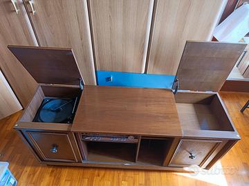 Mobile radio console vintage Lion Stereo con lettore LP, giradischi 16 giri, 33 giri, 45 giri 78 giri. Radio funzionante ma necessita di una revisione: ci sono rumori e qualche tasto non funziona bene.