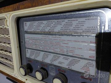 Vendo radio d’epoca a valvole, originale, da tavolo, con mobile in legno e scala parlante con stazioni italiane ed estere.