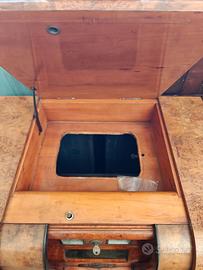 Multigamma IF92 S. Radiogrammofono anni 40, originariamente dotato di radio e giradischi (il giradischi non è presente). disegno elaborato, 2 sportelli scorrevoli che mostrano un cruscotto di controllo con orologio e indicatore di sintonia, uno sportello superiore per proteggere il giradischi, 2 sportelli laterali porta dischi. La strumentazione elettronica non è presente, da considerare come oggetto di arredo. 90x55x100 cm (Larghezza, Profondità, Altezza)