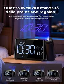 La sveglia da comodino con proiettore deve essere collegata a una presa per l'uso quotidiano e non utilizza batterie per l'alimentazione. La batteria a bottone posteriore ha una funzione di memoria di spegnimento, che può conservare le impostazioni dell'ora e della sveglia quando l'alimentazione è spenta. Un'ulteriore uscita USB consente di alimentare facilmente altri dispositivi intelligenti