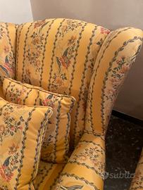 In stile classico, rivestita in prezioso tessuto giallo con motivo floreale e decorazioni verticali.