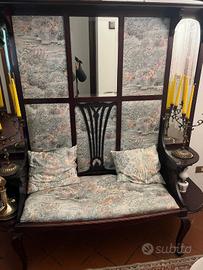 Elegante panca da ingresso in legno scuro, caratterizzata da schienale architettonico con specchiera centrale e raffinato elemento intagliato stile Liberty