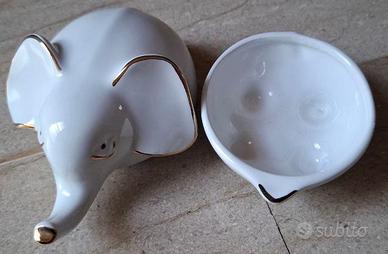 In vendita un elegante elefante decorativo della celebre manifattura italiana Dalla Valle. Realizzato in porcellana bianca lucida di altissima qualità, l'oggetto presenta la proboscide alzata (simbolo universale di buona sorte) ed è impreziosito da finiture in oro applicate sui bordi delle orecchie, degli occhi e della proboscide.