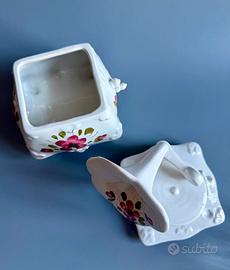Questo elegante pezzo è realizzato in pregiata ceramica bianca, impreziosito da delicate decorazioni floreali dipinte a mano che richiamano lo stile classico e romantico. Un oggetto perfetto per collezionisti o come raffinato elemento di home decor per dare un tocco di nostalgia retrò a qualsiasi ambiente.