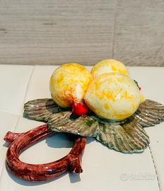 Il soggetto raffigura tre limoni giallo intenso, peperoncini rossi vivaci e foglie verde scuro, modellati con grande realismo in stile trompe-l’œil, per un effetto decorativo elegante e mediterraneo. Ogni dettaglio è curato a mano, rendendo l’oggetto un pezzo unico e irripetibile.