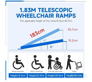 2PCS Rampa Telescopica per Sedia a Rotelle, Max 272 kg 105-183 cm Regolabile, in Alluminio, Antiscivolo, con Capacità di Carico Scale e Ostacoli, Passi in Casa Nella Borsa in tessuto, usato 4 volte, peso kg 6,9.
