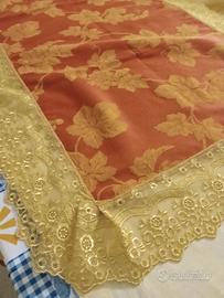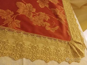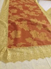 ranner o centrotavola in tessuto spesso raso di cotone stampato e prestigioso pizzo chantilliy nuovo, mai utilizzato misura lunghezza m1,55x73