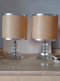 RARITA". Elegante, armoniosa coppia di LAMPADE DA COMODINO. Stile: Tardo ART DECO ( o Streamline ) nato dopo la costruzione dell'Empire State Building in USA.Da qui forma geometrica a gradini verticali Chiamate lampada "GRATTACIELO".Base in VETRO MOLATO con struttura NICHELATA e PARALUMI ORIGINALI( anni 30) in PERGAMENA con normale patina del tempo e in BUONO stato,senza strappi,sfaldature,bruciature. I bordi del paralume sono in ALLUMINIO SPAZZOLATO. Altezza: cm.30 Lasciato volutamente il filo e interruttori originali. Provenienza: eredita' famigliare. Rarita' data per essere una COPPIA.In genere si trovano singole.Per questo Improbabile presenza sul mercato.