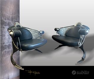 Coppia spettacolare e unica di poltrone disegnate in Italia e realizzate su misura intorno al 2003 in un laboratorio metallico specializzato in Florida, utilizzando componenti aeronautici originali. Queste sedute fanno parte di una serie unica intitolata "JAIL", creata originariamente per una galleria di design di New York.
