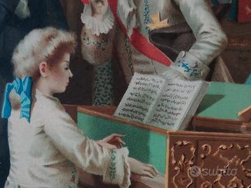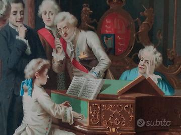 Bellissima oleografia su tela raffigurante Mozart da bambino durante una lezione di musica,con cornice originale,misura cm 64 x 84,soggetto raro per appassionati,verra' spedito professionalmente imballato ed assicurato.