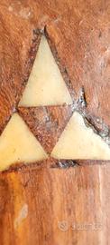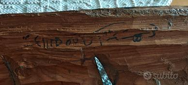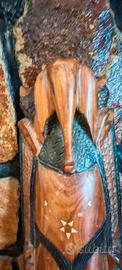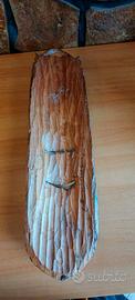 Vendo questo pezzo unico di alto artigianato etnico, ideale per collezionisti o per chi desidera un oggetto d'arredo di grande carattere e presenza scenica. Questa maestosa maschera (altezza 72 cm), di probabile origine senegalese della seconda metà del '900, non è un comune souvenir moderno, ma un’opera realizzata interamente a mano con tecniche tradizionali. Punti di forza e dettagli tecnici: •Materiale: Legno massiccio di essenza tropicale (Mogano/Iroko), dal peso consistente di ben 2,2 kg, sinonimo di robustezza e qualità del materiale. •Intarsi Autentici: Il volto è finemente decorato con intarsi in vero osso sagomati a mano (visibili i micro-pori naturali), incastonati nel legno con precisione artigianale. •Simbologia: La sommità è dominata da un maestoso elefante, simbolo ancestrale di saggezza, forza e protezione. Sotto la bocca è presente un secondo volto stilizzato, tipico delle maschere rituali. •Pezzo Firmato: Il retro riporta l’originale firma incisa dell’autore, a testimonianza dell’autenticità e della paternità dell’opera. Sono ancora visibili i segni netti degli scalpelli usati per lo svuotamento del blocco di legno. •Stato di conservazione: Eccellente. La patina è originale e il legno è stato perfettamente conservato, mantenendo tutta la sua lucentezza naturale. Misure: •Altezza: 72 cm •Larghezza: 19 cm •Peso: 2,2 kg Un oggetto che unisce l'arte tribale al design d'interni, perfetto per ambienti moderni o studi professionali. Disponibile per spedizione accurata con imballaggio protettivo professionale.