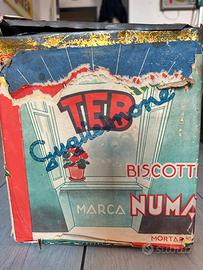 Biscotti Numa, storico marchio di Mortara. Un pezzo autentico di storia dolciaria italiana, caratterizzato da una grafica affascinante che ritrae una finestra aperta con un vaso di fiori, tipica dello stile illustrativo del primo/metà '900.