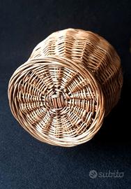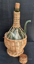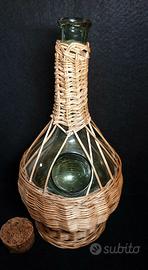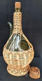 Fiasco italiano d'epoca unico у rarissimo degli anni '50: una tradizionale bottiglia di vetro (solitamente per il vino) in un cesto di vimini, popolare fin dal XV secolo, soprattutto in Toscana o Umbria. Il pezzo originale, realizzato in vetro verde spesso, intrecciato a mano con vite naturale, con un beccuccio curvo, realizzato nello stile tradizionale tipico degli antichi contenitori italiani o francesi per vino o olio. Tali pezzi erano spesso utilizzati nelle zone rurali. Presenta una caratteristica rara: una camera interna in vetro per il ghiaccio, progettata per raffreddare il vino senza diluirlo. Questo design spesso funge da "camera per il ghiaccio": il ghiaccio veniva inserito al suo interno per mantenere la bevanda fredda durante il servizio, soprattutto all'aperto o al caldo. Una camera per il ghiaccio all'interno è una rarità tra i fiaschi. La forma con beccuccio è progettata per versare facilmente vino o bevande alcoliche senza schizzi. Forse il contenitore veniva utilizzato nelle cantine o durante l'imbottigliamento: per versare il vino (soprattutto fatto in casa), per la grappa o altre bevande alcoliche, a volte per l'aceto o i liquori aromatici. Questo oggetto trasmette perfettamente l'atmosfera di un antico villaggio italiano o francese: sembra uscito dalle pagine del libro di cucina di una nonna toscana o da una bottega di un enologo provenzale.Il decanter è ideale per arredare una cucina,una cantina o un interno in stile rustico, country,shabby chic,provenzale. A giudicare dalla tecnologia di intreccio delle viti e dalla presenza di una camera di ghiaccio, il contenitore risale probabilmente agli anni '50-'70. Dopo gli anni '60, la produzione in serie ha complicato la tessitura a mano, quindi il vostro esemplare è un autentico prodotto vintage. Condizioni:buone condizioni vintage, con tracce naturali del tempo. Materiali:vetro,sughero,vite naturale 📏552 g, 35 (ALT) x 18 (DIAM) x 17 (LUNG) cm