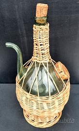Rarissimo Fiasco/decanter italiano d'epoca per vino/grappa con beccuccio in cesto di vimini con camera per il ghiaccio, anni '50 Fascino rustico toscano Fiasco italiano d'epoca unico у rarissimo degli anni '50: una tradizionale bottiglia di vetro (solitamente per il vino) in un cesto di vimini, popolare fin dal XV secolo, soprattutto in Toscana o Umbria. Il pezzo originale, realizzato in vetro verde spesso, intrecciato a mano con vite naturale, con un beccuccio curvo, realizzato nello stile tradizionale tipico degli antichi contenitori italiani o francesi per vino o olio. Tali pezzi erano spesso utilizzati nelle zone rurali. Presenta una caratteristica rara: una camera interna in vetro per il ghiaccio, progettata per raffreddare il vino senza diluirlo. Questo design spesso funge da "camera per il ghiaccio": il ghiaccio veniva inserito al suo interno per mantenere la bevanda fredda durante il servizio, soprattutto all'aperto o al caldo. Una camera per il ghiaccio all'interno è una rarità tra i fiaschi. Dotato di due tappi: uno per il contenitore principale, il secondo per la camera. La forma con beccuccio è progettata per versare facilmente vino o bevande alcoliche senza schizzi. Forse il contenitore veniva utilizzato nelle cantine o durante l'imbottigliamento: per versare il vino (soprattutto fatto in casa), per la grappa o altre bevande alcoliche, a volte per l'aceto o i liquori aromatici. Questo oggetto trasmette perfettamente l'atmosfera di un antico villaggio italiano o francese: sembra uscito dalle pagine del libro di cucina di una nonna toscana o da una bottega di un enologo provenzale. Il decanter è ideale per arredare una cucina, una cantina o un interno in stile rustico, country, shabby chic, provenzale. Un regalo perfetto per gli amanti dello stile rustico e dell'accoglienza rustica! 1950-'70.Condizioni: buone condizioni vintage, con tracce naturali del tempo. Tappi inclusi. 📏 Dimensioni: 552 g, 35 (a) x 18 (p) x 17 (l) cm
