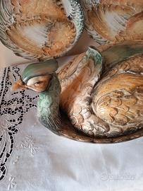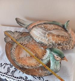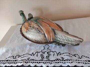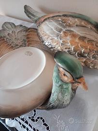 Servizio Artistico Dipinto a Mano – (Grande Piatto da Portata + 5 Piatti) UN'OPERA D'ARTE PER LA TAVOLA: Splendido e imponente set da portata in maiolica policroma, un capolavoro dell’artigianato italiano degli anni '70 firmato dalla storica manifattura R.B. (R. Blance) Italia. Non è un semplice servizio , ma una vera scultura da esposizione che arricchisce ogni ambiente. LAVORAZIONE IN RILIEVO E COLORI VIVI: Il pezzo centrale è Imponente Scenografico (ca. 50x29 cm mezzo metro di lunghezza) e riproduce un fagiano a grandezza naturale. La particolarità è la lavorazione tutta in rilievo: ogni piuma è scolpita e si sente al tatto, donando un realismo incredibile. Colori: Meravigliose sfumature dipinte a mano che vanno dal verde smeraldo lucido della testa all’ocra e marrone del piumaggio. Smalto: Finitura cristallina che rende l'oggetto brillantissimo, come se fosse nuovo. CONDIZIONI E STORIA: Il servizio è di famiglia, mai usato per mangiare. I piatti sono stati conservati solo come decorazione appesi al muro o in vetrina. Lo smalto è integro, senza segni di posate. Il vassoio uguale mai usato spostato da una vetrina a l'altra. Trasparenza: Per massima onestà, si segnalano piccolissimi segni dovuti agli spostamenti nel tempo (una sbeccatura interna nella coda del coperchio, e due piccoli punti sulla sul bordo di un piatto). Come visibile dalle foto, sono dettagli minimi che non si vedono assolutamente quando il pezzo è esposto e non tolgono nulla alla sua bellezza. IL SET COMPRENDE: 1 Grande Piatto da Portata Scultoreo con coperchio (50x29 cm). 5 Piatti coordinati giganti (30x23 cm) con piumaggio in rilievo. IDEALE PER: Collezionisti, arredamento vintage di lusso, case di campagna o per chi vuole un centrotavola unico per pranzi importanti. Per qualsiasi informazione contattatemi. Considerando la delicatezza del servizio rischiare di romperlo. CONSEGNA SOLO A MANO