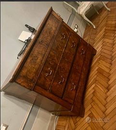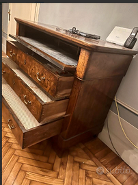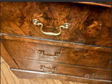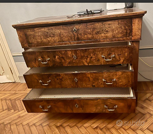 PREGIATISSIMA ed ESCLUSIVA COMMODE/COMO'/CASSETTIERA in radica di noce con intarsi architettonici. La struttura include tre cassetti principali frontali e un piano superiore. Antica riconducibile al XIX secolo. CONDIZIONI: ottimo stato conservativo ma essendo un articolo antico/vintage può presentare i lievi segni del tempo che ne attestano l'originalità e il fascino. Proveniente da collezione privata Villa Veneta del '900. MISURE: L125xh100xp58cm. Visibile e Ritirabile zona Treviso DETTAGLI: Questo tipo di cassettiera rappresenta la tradizione dell'ebanesteria europea del XVIII secolo, diffusa in Italia e nelle regioni austro-ungariche durante il periodo Biedermeier. La tecnica dell'impiallacciatura in radica di noce, apprezzata per le sue venature naturali e il calore cromatico, era simbolo di raffinatezza e status sociale. Le maniglie in bronzo e la struttura a cassetti riflettono la funzionalità unita all'estetica tipica dell'epoca.