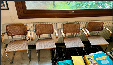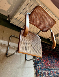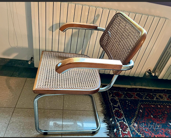 ESCLUSIVITA: nr4 RICERCATE poltroncine/sedie con bracciolo "CESCA" originali anni 60 Alto DESIGN by Marcel Breuer per Gavina in paglia di Vienna. CONDIZIONI: ottimo stato conservativo ma essendo un articolo antico/vintage può presentare i lievi segni del tempo che ne attestano l'originalità e il fascino. Proveniente da collezione privata Villa Veneta del '900. VISIBILI e RITIRABILI zona Treviso. CARATTERISTICHE: Descrizione dell'oggetto La Sedia Cesca (o Chair Cesca) è uno dei design più iconici del XX secolo, creata dal celebre designer ungherese Marcel Breuer nel 1928. È un esempio di come il design modernista abbia rivoluzionato il concetto di mobili e l'uso dei materiali nell'arredamento. Progettazione e caratteristiche La sedia Cesca fu originariamente progettata per la fabbrica di mobili italiana Gavina, che nel 1960 iniziò a produrla in grande serie, portandola all'attenzione internazionale. La sedia Cesca si distingue per la sua struttura semplice, ma elegante, che fonde perfettamente estetica e funzionalità. È realizzata con un telaio in acciaio tubolare, materiale che Breuer aveva già utilizzato per altre sue creazioni (come la famosa sedia B3, detta anche "Sedia Wassily"). Le caratteristiche principali della sedia Cesca sono: Struttura in acciaio tubolare cromato: Il telaio è leggero, ma resistente, ed è caratterizzato da un'inconfondibile curvatura che diventa un elemento distintivo del design. Sedile e schienale in rattan: La sedia presenta un sedile e uno schienale in rattan intrecciato, che conferisce comfort e una texture naturale. Questo materiale è molto apprezzato per la sua resistenza e per l'estetica che richiama la tradizione artigianale, pur essendo un materiale moderno e funzionale. Design a "X": La seduta e lo schienale si inseriscono in un telaio che ha la forma di una "X" stilizzata quando visto lateralmente, un elemento che risalta per la sua asimmetria e dinamismo.