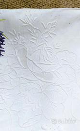 Questa parure non è un semplice set da letto, ma un esempio di alto artigianato italiano del dopoguerra. Il pezzo forte è il ricamo a mano con motivi floreali a rilievo, una tecnica complessa che dona tridimensionalità e prestigio al tessuto.