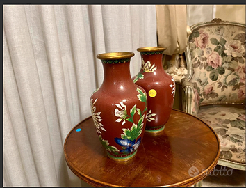 PREZIOSA Coppia vasi cinesi CLOISONNE' altrimenti chiamati i LUSTRI di BISANZIO. Realizzati con un'antica e rinomata tecnica decorativa cinese che combina diverse forme artistiche.