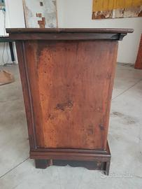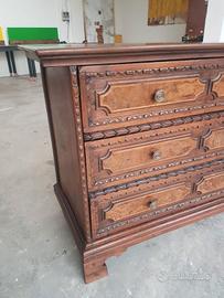 Raro cassettone Bergamasco della prima metà del '600 a tre cassetti in noce. Con formelle in radica di noce sui frontali dei cassetti. Troviamo catene intagliate a foglia d'alloro sul frontale del mobile. Originale dell'epoca, di ottima qualità e già restaurato!